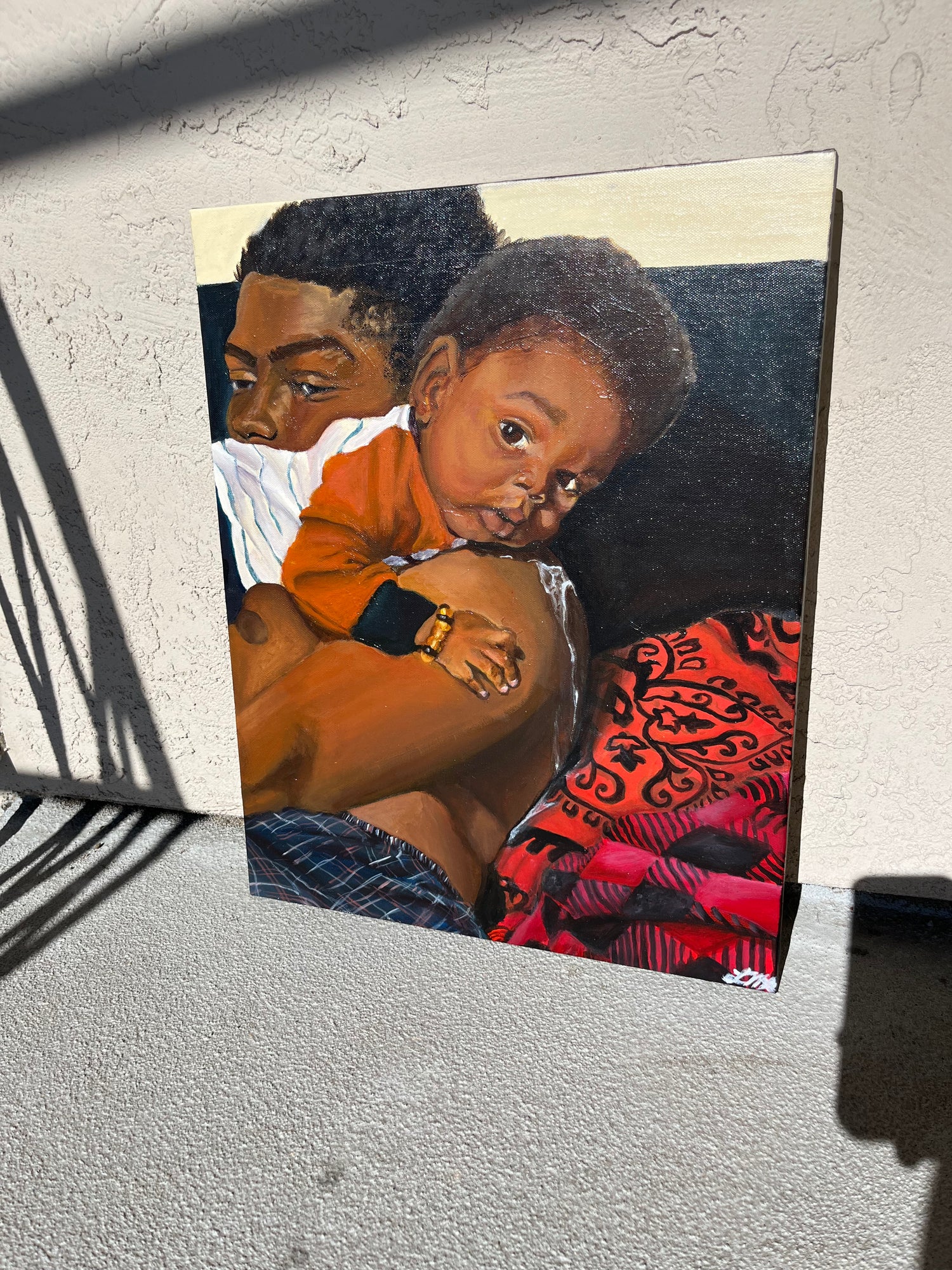 St. Louis bred, SF Bay Area based multimedia artist Lauryn Marshall (Art by Marshall) uses color, figure and object composition, and fantastical elements as tools for storytelling to highlight the lived experiences of those from the African diaspora. Marshall comes from a line of Bahamian and Creole ancestry, peaking her interest in the many expressions of Blackness that exist in the world. She dove into art at the early age of 2, coming from a long line of predecessors that were actively engaged in community building throughout the South. Though influenced and inspired by many role models within her family, Grandma Robbie was Marshall’s first art teacher and entrepreneurship mentor. At “Robbie’s Custom Leadergoods”, Marshall was inspired by the textiles her Grandmother created and it exposed her to different art mediums.